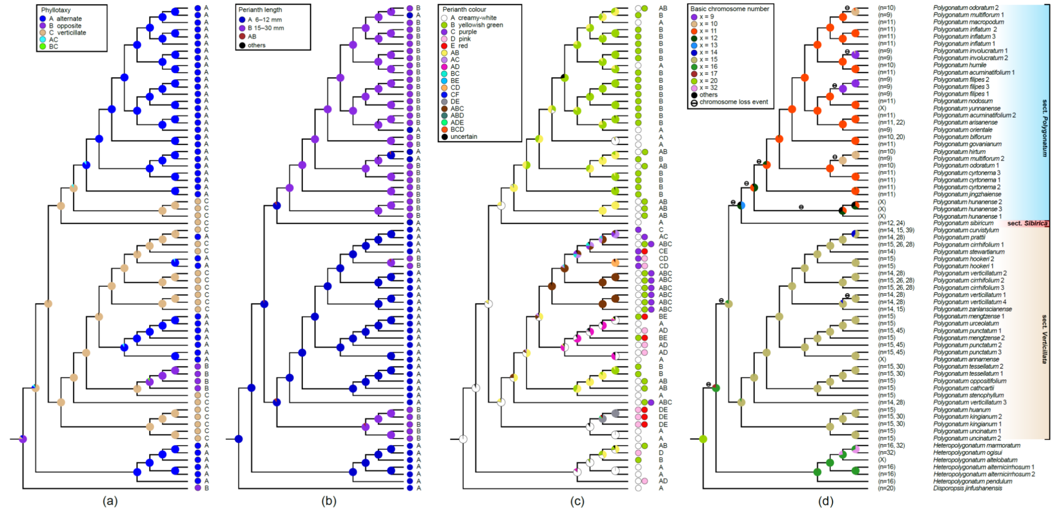 图2 祖先性状重建(a)叶序,(b)花被管长度,(c)花被颜色,(d)基本染色体数目