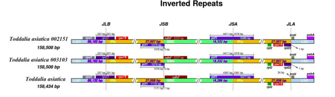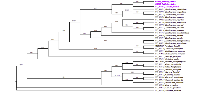 研究结果表明:(1)飞龙掌血叶绿体基因组大小为158508 bp,有一个大的单拷贝(LSC)区,SSC和两个反向重复(IR)区。该基因组包含113个基因(图1,2)。(2)比较基因组学分析显示基因排列具有高度相似性;trnH-psbA、rpoB和ycf1可用于有效的遗传标记。(3)系统发育分析支持将飞龙掌血属(Toddalia)和花椒属(Zanthoxylum)合并,飞龙掌血的拉丁名由原来的“Toddalia asiatica”修订为“Zanthoxylum asiaticum”(图3)。(4)生物地理学研究表明,飞龙掌血属植物起源于亚洲,而后扩散到非洲和马达加斯加等地(图4)。