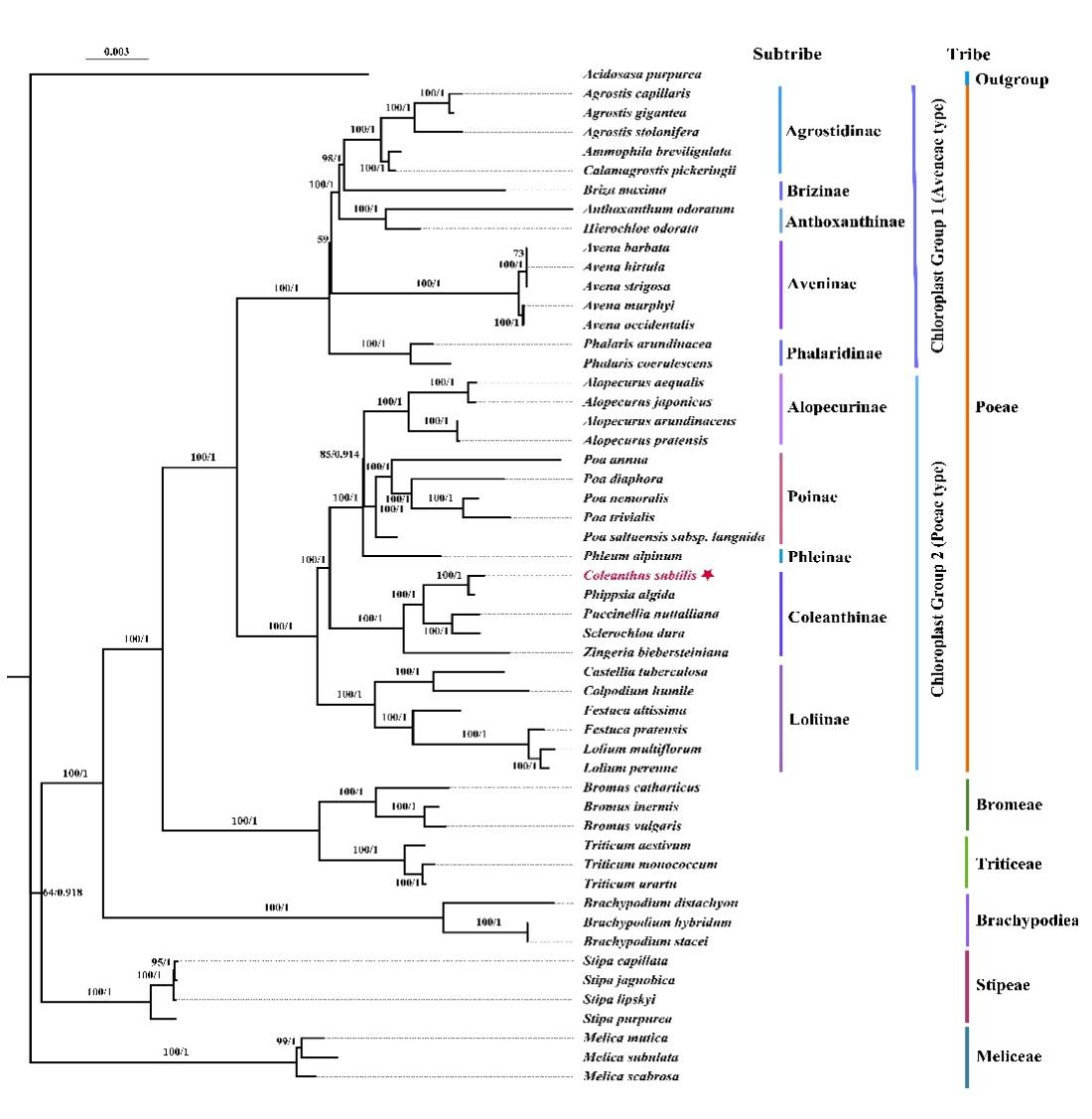 莎禾[Coleanthus subtilis (Tratt.) Seidel]是禾本科(Poaceae)莎禾属(Coleanthus Seidl)一年生草本,喜生于河岸、湖旁的水湿处。其分布区广泛但不连续,已被记录分布于欧洲中西部、挪威南部、俄罗斯、中国、美国和加拿大。莎禾的生命周期极短,需要严格的栖息繁殖条件,因其栖息地正遭受破坏等原因,它的数量稀少,在诸多国家被列为保护植物,如捷克共和国和北美地区。在2021年我国发布的《国家重点保护野生植物名录》中,它也被列为二级保护植物。此外,莎禾能在长时间间隔后重新出现在以前的栖息地。2021年3月,研究人员在长江沙滩上发现了莎禾,随后武汉植物园研究人员在黑龙江哈尔滨松花江流域也采集到了它,这距离其上一次在中国的采集间隔了将近一百年。有趣的是,由于本种植物主要分布在北暖温带地区,此前在长江流域的发现被怀疑为偶然外来事件,而最近的发现却不支持这一推测,造成这种特殊分布格局的历史和原因尚不清楚。同时,莎禾的系统位置及莎禾亚族的组成存在争议,叶绿体基因组信息的缺失极大地限制了对其系统发育的全面了解。