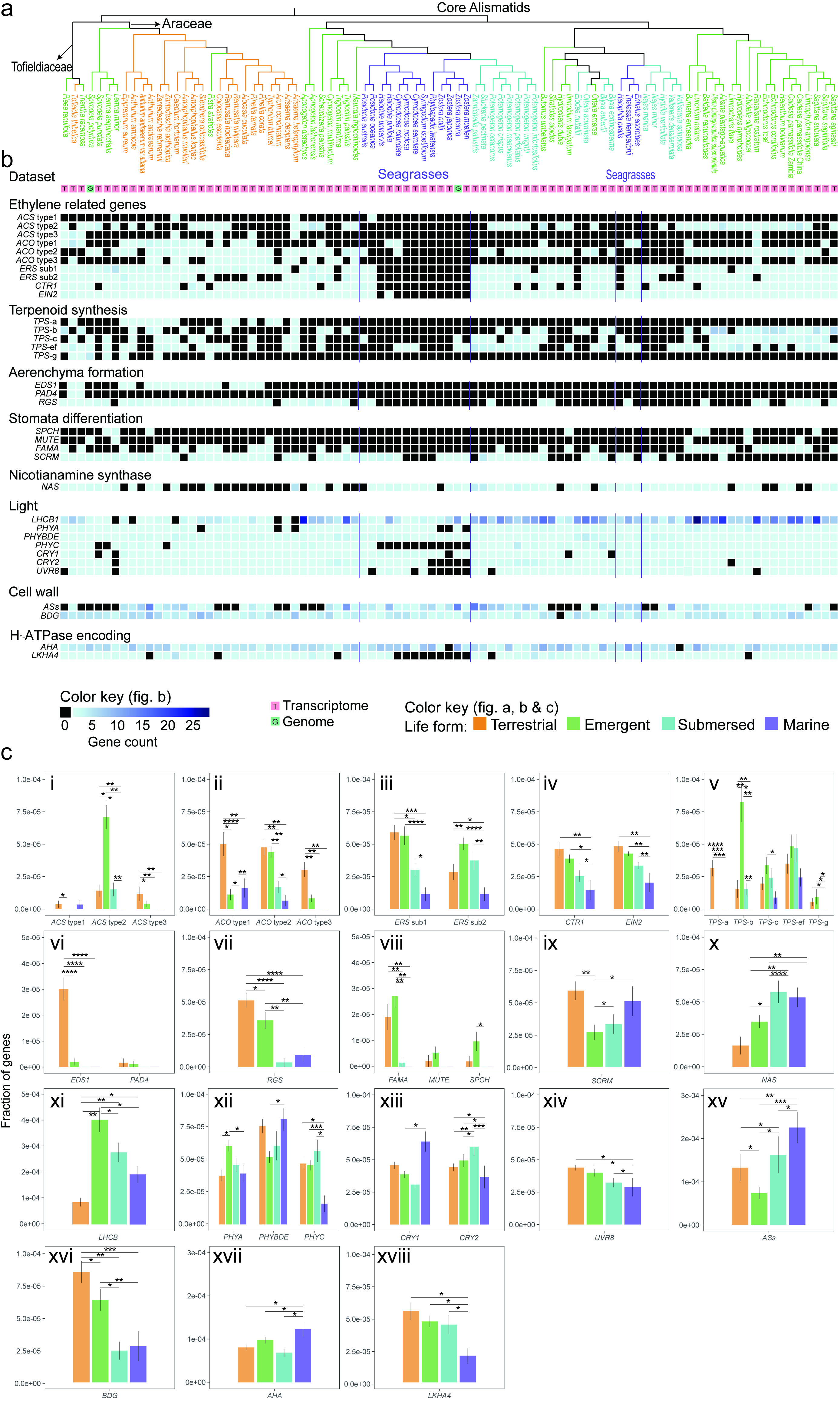 泽泻目是已知的水生植物分布最为集中的一大类群,包含了所有海生高等植物和分布广泛且具多种生活型的淡水水生植物,是研究植物适应水生(海生)环境演化过程的理想材料。武汉植物园王青锋研究团队与中国药科大学、复旦大学、慕尼黑大学、德克萨斯州大学的相关研究人员合作开展了泽泻目植物适应水环境的分子机制研究,对中国、美国、澳大利亚和欧洲分布的59种泽泻目植物进行了广泛取样,完成了转录组测序、核基因和叶绿体基因的系统进化分析。研究结果表明,泽泻目植物经历了从陆生向淡水生、再到海生的演化过程,核心泽泻目、天南星科、岩菖蒲科之间的系统进化冲突主要由不完全谱系筛选与基因渐渗造成,上述类群之间最真实的进化关系是(岩菖蒲科,天南星科) + 核心泽泻目。系统进化和Ks分析共鉴定出18个全基因组复制事件,其中1个发生于核心泽泻目的共同祖先,3个发生于海生类群。对适应水生环境重要基因的分析发现,海生的大叶藻(Zostera marina)大量丢失的光、乙烯相关基因并没有在其它海生和淡水生植物中普遍丢失,烟碱胺合成酶基因在沉水植物和海生植物中发生了扩张,这可能与水生环境(特别是海洋环境) 铁离子含量较低有关。