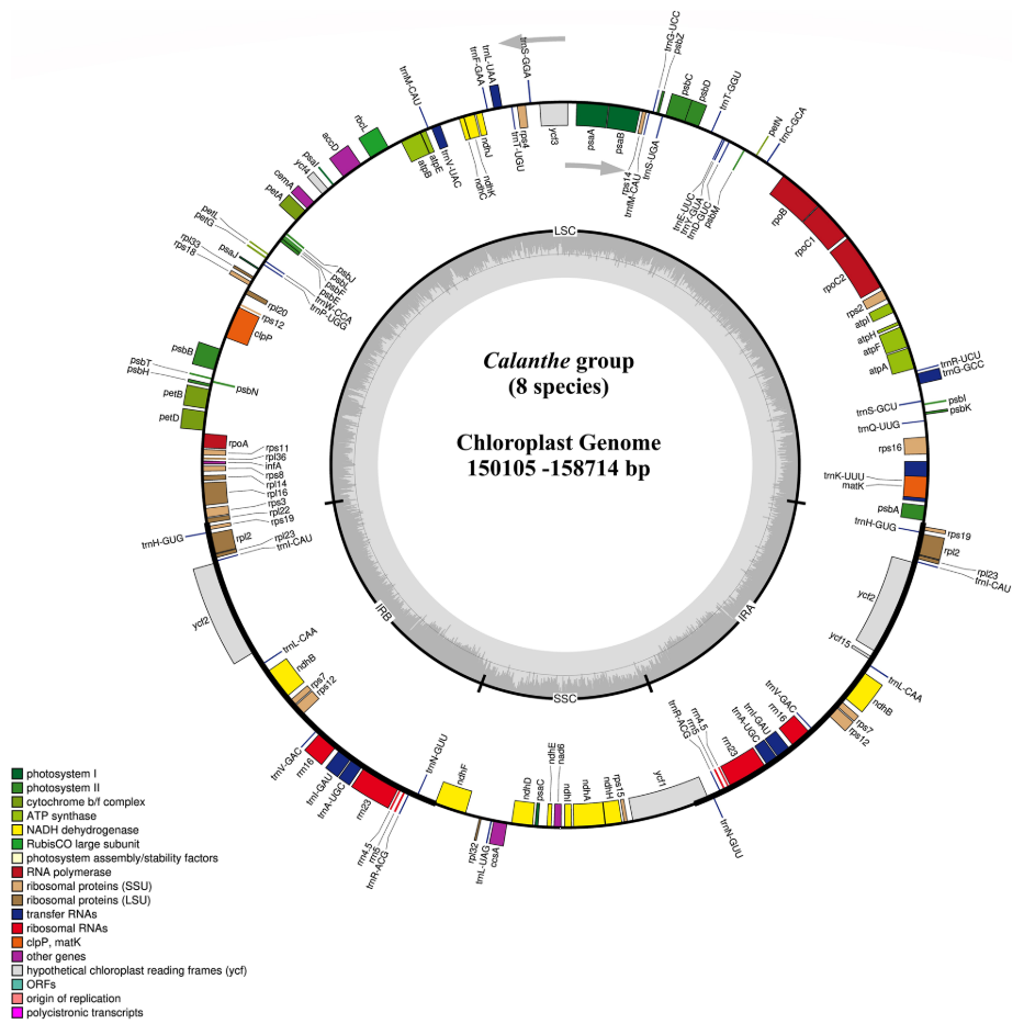 研究结果显示:(1)8个广义虾脊兰属质体为典型的四分体结构(LSC、SSC和一对IRs),大小在150,105bp-158,714bp之间。质体基因组总GC含量在36.6 ~ 36.9%之间,编码131 ~ 134个不同基因(图2)。(2)比较基因组分析表明8个质体基因组的大小、结构、基因顺序和内容都高度保守。其中C. delavayi (P. delavayi)丢失了ndhC、ndhF和ndhK基因,导致其IR区域收缩。此外,筛选出以下8个高变区域和基因:trnS-GCU-trnG-GCC, rpoB-trnC-GCA, trnE-UCC-trnT-GGU, rpl32-trnL-UAG, ccsA-ndhD,psbL, clpP 和 rpl32,可用于DNA条形码的开发。(3)基于这8个质体基因组数据以及于NCBI获取的14个虾脊兰族73个蛋白质编码基因数据的系统发育分析结果(图3)显示:虾脊兰属与鹤顶兰属构成一并系,支持将Phaius delavayi移至虾脊兰属中,更名为Calanthe delavayi。该研究进一步对兰科植物叶绿体基因组进行解析对阐明完整质体的多样性、物种鉴定、系统发育以及兰科植物物种间的进化关系具有重要意义。