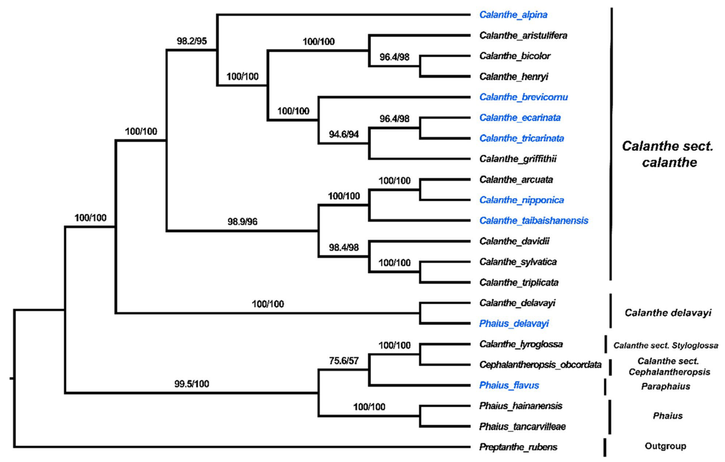 虾脊兰属(Calanthe)是兰科(Orchidaceae)树兰亚科(Epidendroideae)中最大的泛热带属,分布于亚洲、非洲、澳大利亚、马达加斯加、中南美洲和加勒比海地区。虾脊兰属(Calanthe R. Br.)、黄兰属(Cephalantheropsis Guillaumin)和鹤顶兰属(Phaius Lour)三者近缘,组成树兰亚科下一单系类群,但其内部的分类问题混乱,尤其是在虾脊兰属和鹤顶兰属之间的关系上一直存在争议。