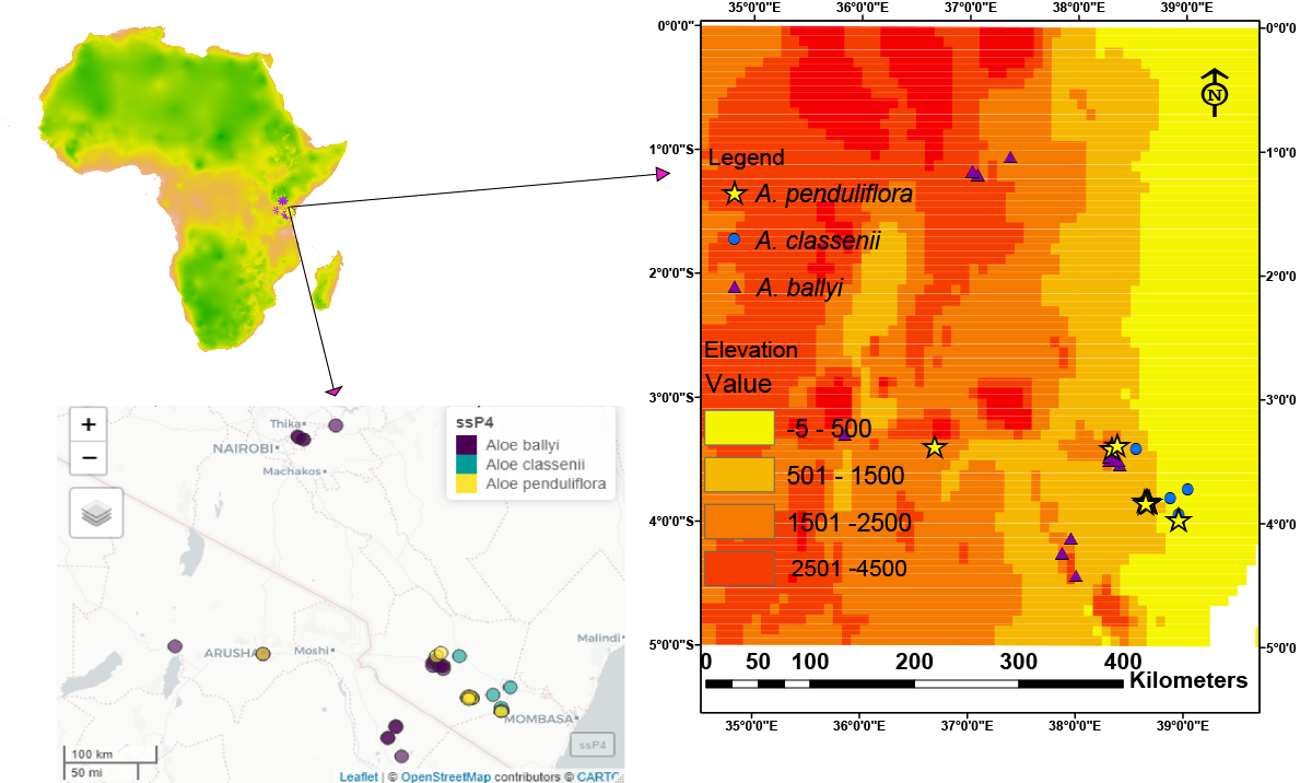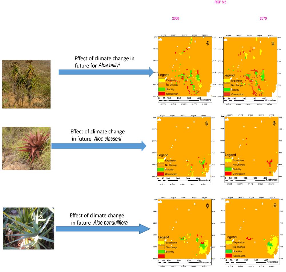 中国科学院武汉植物园东非植物区系与分类学科组分析了气候变化对东非三种特有的濒临灭绝的芦荟属植物潜在分布的影响。该研究使用Global Climate Model对肯尼亚和坦桑尼亚特有的三种极危芦荟属植物:Aloe ballyi Reynolds, A. classenii Reynolds和A. penduliflora Baker的适宜栖息地的当前分布进行建模,以确定2050年和2070年气候变化对其适宜栖息地的影响。通过使用两种有代表性的浓缩和排放情景(RCP4.5和RCP8.5)来预测物种适宜栖息地的收缩,发现降水、温度和环境变量(潜在蒸发量、土地覆盖、土壤沉积和太阳辐射)对这三个物种的当前分布都有着重大影响,预计原始适宜栖息地的损失将十分严重,A. ballyi 和 A. classenii 的原始栖息地将会分别被摧毁超过44%和34%。基于得到的研究结果,作者建议将预计因气候变化而萎缩的适宜栖息地指定为芦荟属植物保护的关键保护区。