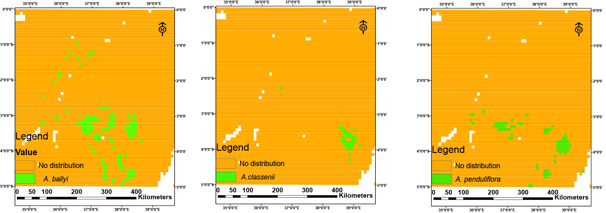 图2 A.ballyi、A.classenii和A.penduliflora的当前分布范围(绿色),以及该物种未分布的地方(黄色)
