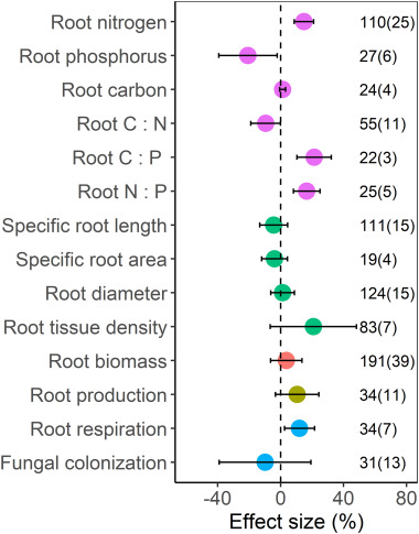 中国科学院武汉植物园全球变化生态学学科组博士生赵小祥在刘峰研究员的指导下,通过在全球范围内收集和整理氮沉降对森林细根功能特征影响的数据,运用整合分析揭示了森林细根功能特征对氮沉降的响应。结果表明,氮沉降主要影响细根的元素含量及其化学计量比,但对细根形态和生理功能特征没有显著影响(除了细根呼吸)。在高水平的氮沉降条件下,氮沉降对细根生物量的影响随着氮沉降时长增加而减少。氮沉降对细根直径的影响随着年平均气温和年平均降水量的增加而减少。该研究使我们对氮沉降如何影响木本植物的细根功能特征有了更加深入的认识,这为研究氮沉降对土壤碳库的影响提供了新的研究视角。