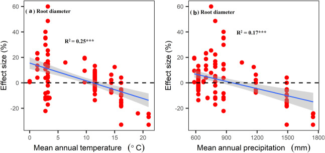 图2 氮沉降对细根直径的影响与年均气温及年均降水量的关系