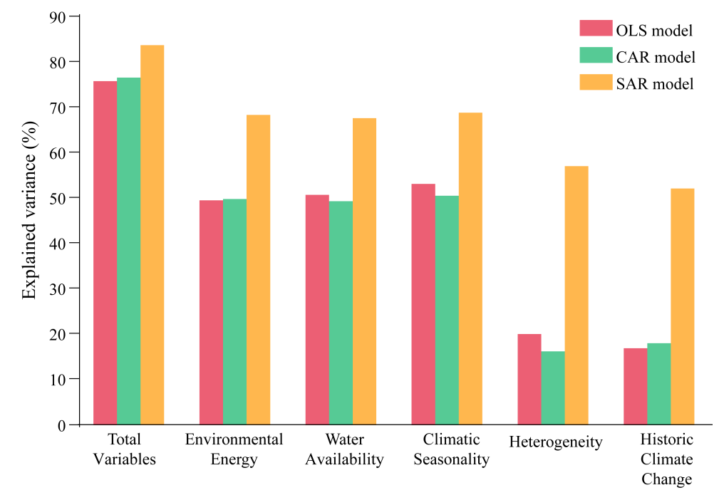 图2 利用简单普通最小二乘模型(OLS)、简单条件自回归模型(CAR)和同步自回归模型 (SAR)三种不同模型分析环境能量、水资源可利用性、气候季节性变化、空间异质性和历史性气候变化假说对中国荚蒾属特有类群丰富度的解释