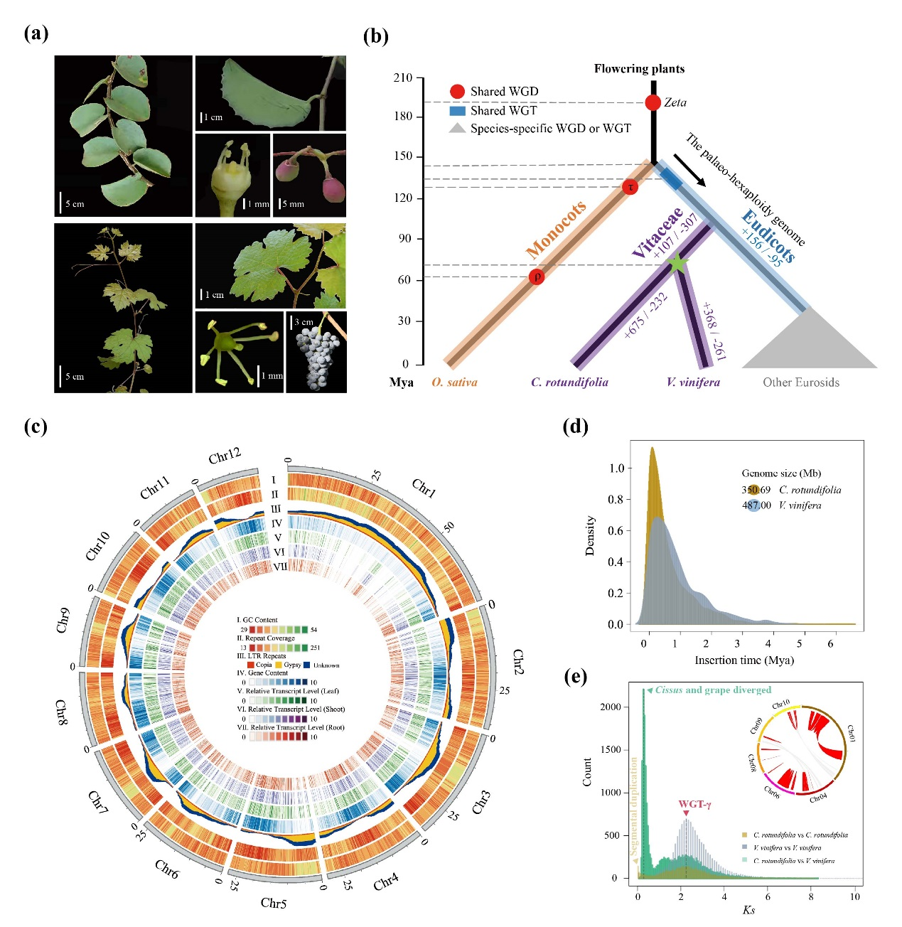 研究发现,圆叶白粉藤约在60.19–84.68百万年前与葡萄发生分化。其基因组并未发生独立的加倍事件,其较小的基因组可能与约在9.7万年前发生过一次转座子爆发和有效偏好性的转座子消除有关。与葡萄染色体的共线性以及祖先核型预测分析表明,圆叶白粉藤分化过程中发生过多次染色体重排和染色体片段复制事件。与葡萄相比,圆叶白粉藤中显著扩张的基因家族如:HSP-20, NBS-LRR等可能与其适应干旱生境有关。景天科酸代谢途径(CAM)关键酶展示出明显的昼夜表达节律,支持了圆叶白粉藤中存在高水分利用效率的CAM代谢,为研究葡萄科中CAM途径的起源提供了线索。此外,文章还就多肉植物在功能基因家族的共进化方面进行了分析和讨论。