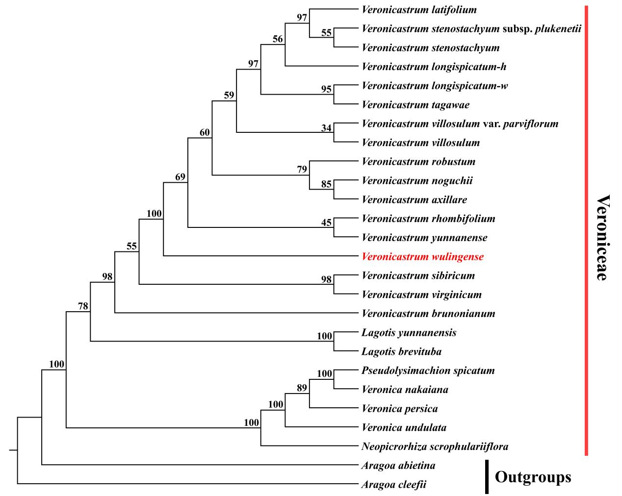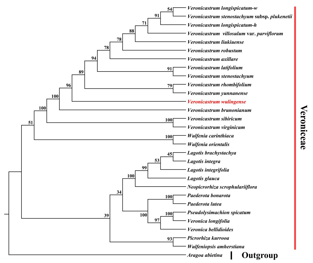 经过对腹水草属深入的形态学及分子系统学研究,证实了该植物为此前文献从未记录的腹水草属植物新类群,根据其模式产地鄂西武陵山区,故命名为“武陵腹水草”。它在形态上与分布于琉球群岛的琉球腹水草(Veronicastrum liukiuense)较为相似,但是前者为腋生的穗状花序,花色紫色至紫红色,花梗可长至2.5 cm,花期6–7月,分布于海拔1000–1400 m的石灰岩山地,而后者花序着生于侧枝顶端,花色白色略带淡紫色,无花梗,花期9–10月,分布于海拔较低的海岛。此外,花序梗长达7 cm,花朵密集簇生在花序轴顶端,长约2-3 cm,这是在所有已知的花序腋生腹水草种类中所独有的。而分子系统学研究表明,该新种处于系统树上的单独一枝(图2和图3)。该新种的发现,体现了鄂西武陵山区生境的多样化及极高物种多样性,同时对研究东亚腹水草属的物种形成与演化及生物地理学具有重大意义。