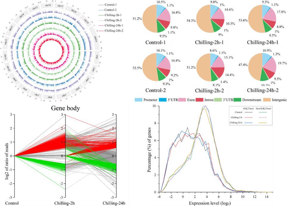 图:山葡萄中H3K27me3均匀分布于基因区与基因间区,低温下H3K27me3先变化后回复到处理前水平,H3K27me3在基因组水平上抑制基因的表达