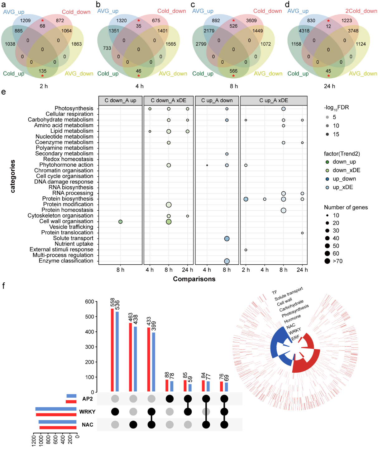 中国科学院武汉植物园联合澳大利亚国立大学生物研究院、中国科学院植物研究所、湖北省农科院、新疆农业科学院吐鲁番农业科学研究所等多位科研人员,选取冬季极耐寒的野生葡萄品种山葡萄(V.amurensis)的叶片作为实验材料,研究了低温胁迫下葡萄叶片转录组和植物激素的变化,鉴定了在低温胁迫下ETH调控的基因,并讨论了ETH与其他低温诱导的植物激素之间可能的相互作用。结果表明,AP2/ERF和WRKY转录因子(TF)是两个高度富集的TF家族,在低温胁迫下持续上调,但被AVG抑制。通过比较葡萄叶片在低温处理下和低温并外源喷施AVG处理下的转录组,可以鉴定潜在的ETH调控基因。受ETH正向调控的基因在溶质转运、蛋白质生物合成、植物激素作用、抗氧化和碳水化合物代谢等方面富集。在低温胁迫下,ETH、IAA、ABA的合成和信号通路相关基因表达上调,而AVG则抑制这种上调。ETH、ABA和IAA在低温下的含量变化与转录组数据一致,表明ABA和IAA在低温胁迫下的响应可能是通过ETH信号通路调控的。