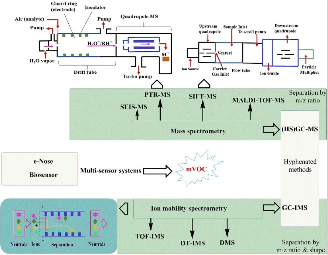 中国科学院武汉植物园范民霞助理研究员在郭明全研究员的指导下,总结了mVOCs的种类及其产生机制。同时,汇总了顶空、吹扫捕集、固相微萃取和针式捕集法等mVOCs采样方法,并对mVOCs的分析方法(离子迁移谱法、电子鼻法、生物传感器等)及其在食品微生物污染检测中的应用进行了系统的回顾;最后,指出便携式设备、新兴的新材料、高通量和现场检测、高性价比和大规模生产的分析仪器将成为未来mVOCs检测的有希望的方向。