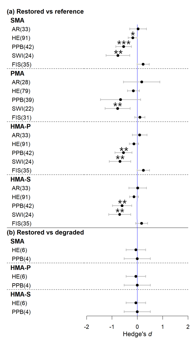 被恢复植物种群的遗传多样性显著低于参照种群,但是与退化种群相当。木本而非草本植物、森林而非草地生态系统的被恢复植物种群的遗传多样性显著低于参照种群。被动而非主动恢复、直接播种而非活体种植、多种源混合而非单种源可以显著提高被恢复植物种群的遗传多样性。当恢复时间小于50年时,被恢复植物种群的遗传多样性显著低于参照种群,而当恢复时间大于等于50年时,被恢复种群的遗传多样性与参照种群相当。