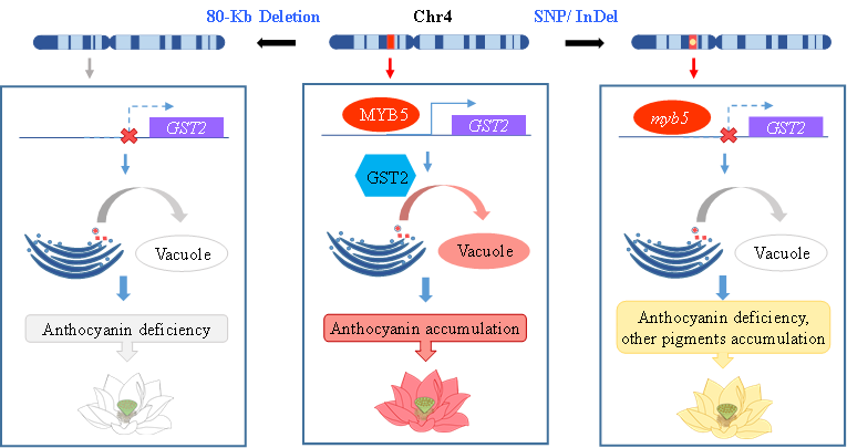 研究者通过红色和白色亚洲莲F2群体的QTL定位,明确了控制亚洲莲花瓣颜色分化的候选基因NnMYB5,并对213个莲种质资源进行基因分型发现包含NnMYB5基因的一个80 kb存在/缺失结构变异(PAV)与花瓣颜色关联。进一步通过转录组分析、双荧光素酶和酵母单杂交实验表明,NnMYB5能够直接激活花青素转运蛋白NnGST2。最后在拟南芥中异源表达及莲花花瓣中超表达NnGST2,均可诱导花青素积累。本研究建立了NnMYB5和NnGST2在花瓣花青素积累中的调控关系,并证明在亚洲莲中控制花色形成的独立调节机制。