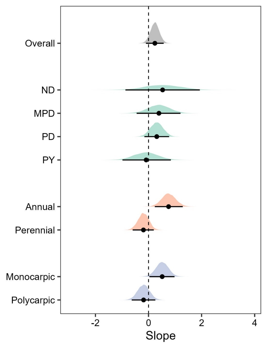 综上,本研究在半自然条件下,通过对349个物种长达42年的盆栽试验,统计了多年累计出苗率,量化了种子持久性,并应用贝叶斯系统发育混合模型,对以下假设进行了检验:(1)种子持久性与累计出苗率存在权衡关系;(2)与具有非休眠种子、多年生和多次繁殖物种相比,具有休眠种子、一年生和单次繁殖物种的种子具有更长的持久性和更低的出苗率;(3)相比于小种子,大种子持久性更短但出苗率更高,种子大小影响种子持久性与出苗率的权衡关系。