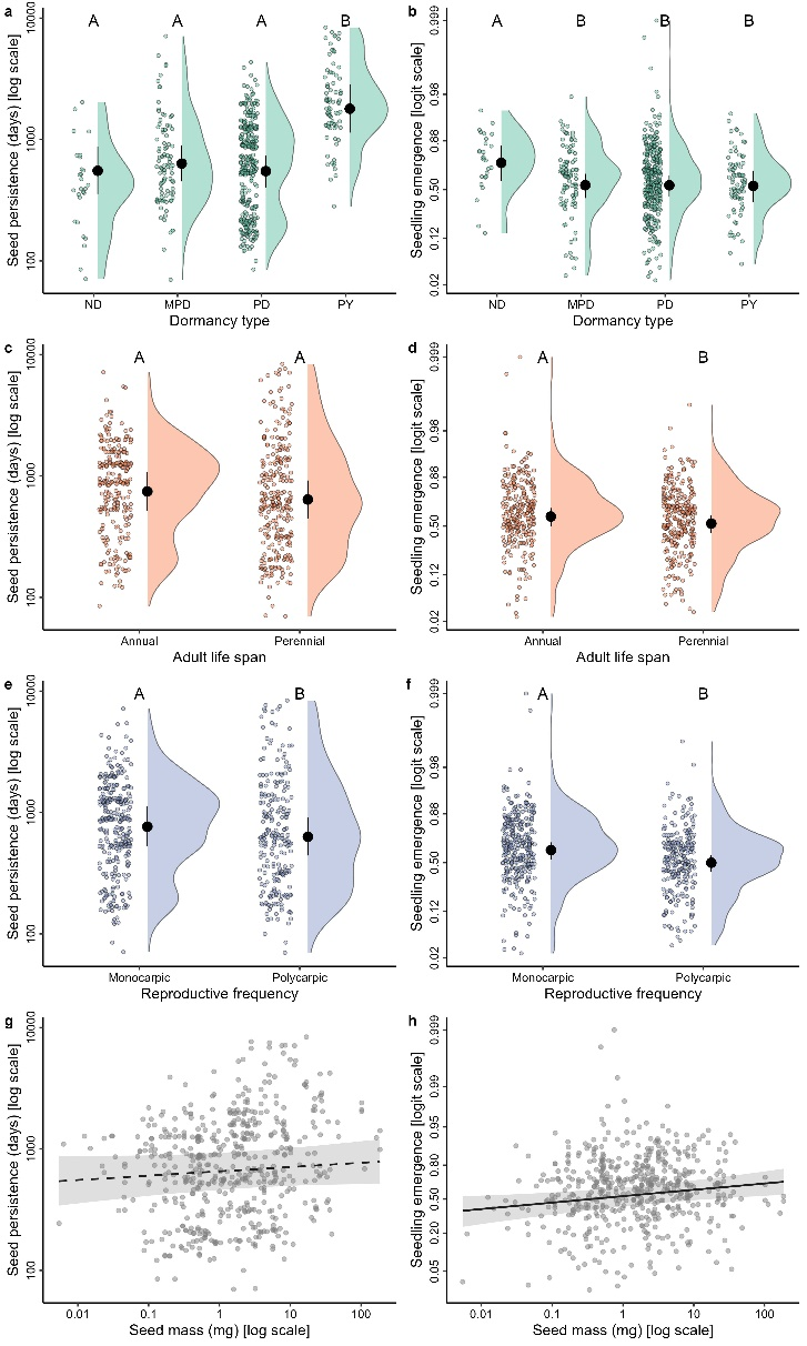 图2 不同更新性状下种子在土壤库中的持久性和累积出苗率。雨云图和散点图描述了原始数据,黑色点线和回归线代表贝叶斯模型后验分布的平均值和95%置信区间,字母代表组间的显著差异。
