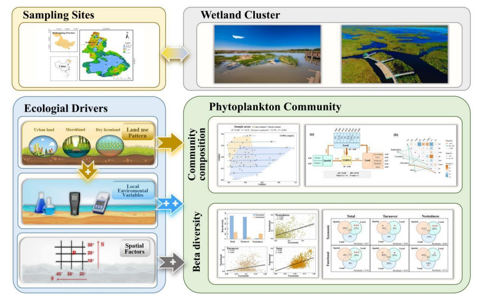 研究成果以“Local environmental variables outperform spatial and land use pattern in the maintenance and assembly of phytoplankton communities in the wetland cluster”为题发表于国际著名环境科学类学术期刊Journal of Cleaner Production。研究受到了国家自然科学基金((Nos. 31970213, 31870187)的资助。