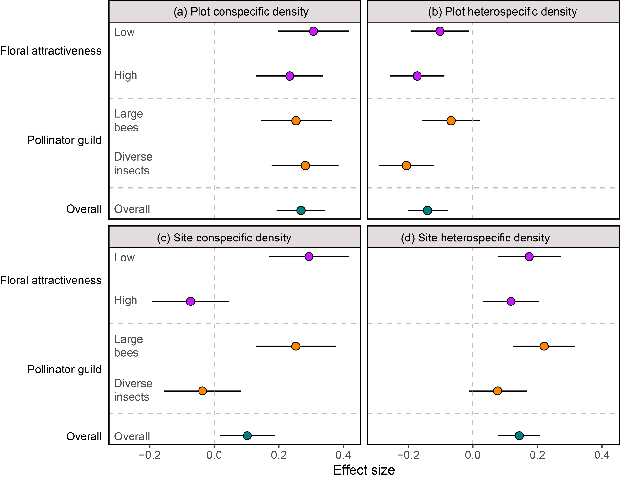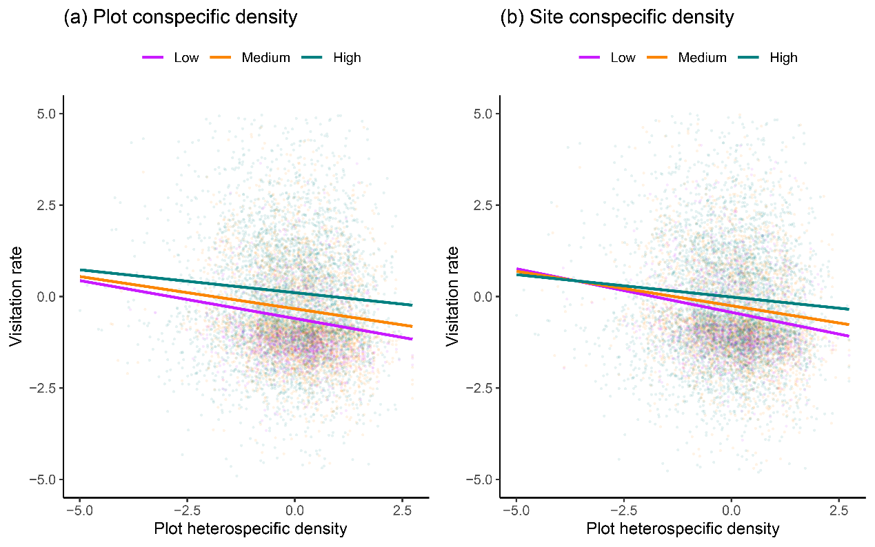 研究结果表明,植物传粉频率受到同种和异种花密度的影响,稀有种在样方水平更易遭受种间竞争,但在群落水平则通过种间开花植物获得促进效应(图1)。同时,样方水平的种间竞争对于具有泛化传粉系统的植物更为明显,对于该地区最广泛的熊蜂访花植物而言,群落水平的种间促进更为显著(图2)。此外,对于传粉者吸引能力弱的植物而言,种内正密度效应更强。因此,该研究揭示了在开花植物多样性极其丰富的区域,传粉密度依赖效应对于维持稀有植物物种、促进植物多样性起到了重要的平衡作用,而这种平衡作用又受到了空间尺度、传粉生态位以及植物对传粉者的吸引属性的影响。
