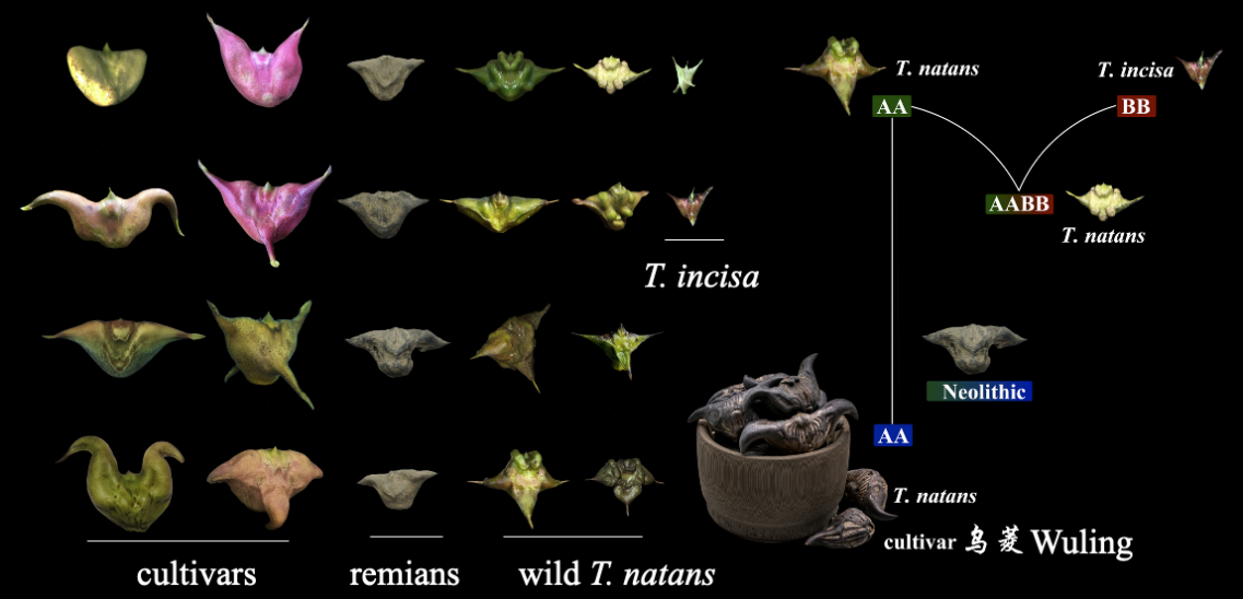 水稻、玉米和小麦为三大主粮作物,占据了世界粮食产量的 80%以上,主粮来源单一也成为全球粮食安全和营养安全的隐患,对“孤儿作物”(orphan crop)的重视利用是应对粮食安全危机的有效手段之一。然而,随着城乡现代化进程的持续推进和现代集约化农业的快速发展,“孤儿作物”野生种和地方品种资源正日趋减少,与主粮作物相比,其种质资源的研究及现代育种技术的应用严重滞后。菱角就是一种典型的“孤儿作物”,自新石器时代以来,长江流域的先民开始有意识地大规模采集、驯化菱角,在南宋时期已成为江南地区的主粮之一,仅太湖地区就形成了包括“乌菱”、“南湖菱”等20多个栽培品种。随着基因组学技术的发展,泛基因组研究已成为全面理解作物重要性状形成机制的重要手段,被广泛应用于作物育种改良。近日,武汉植物园东亚植物演化、保护与利用学科组邱英雄研究员团队在Horticulture Research期刊以Research article形式在线发表了题为“Pangenome of water caltrop reveals structural variations and asymmetric subgenome divergence after allopolyploidization”的研究论文。