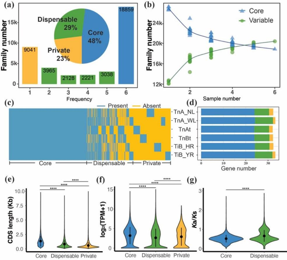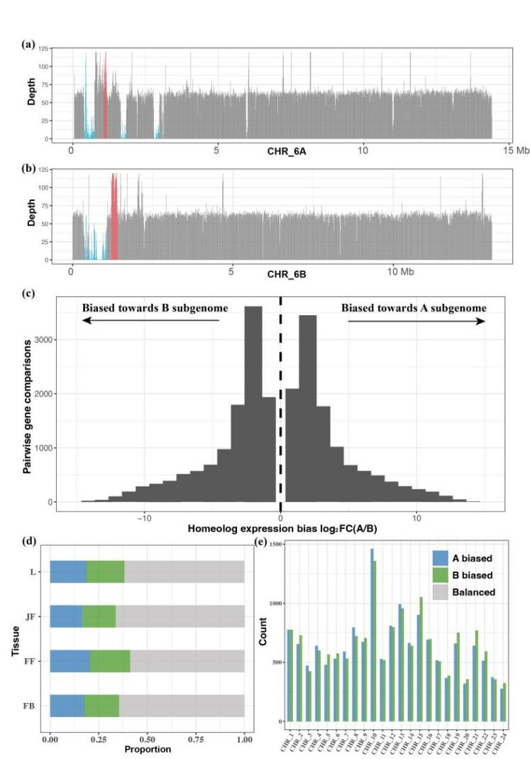 菱属(Trapa L.)包含欧菱(T. natans)和细果野菱(T. incisa)两个种,其中欧菱包括异源四倍体(AABB)与二倍体(AA)两种倍性,而细果野菱(BB)为二倍体,栽培菱角即驯化于形态较大的二倍体欧菱(图1)。本论文组装了菱属两个二倍体物种的高质量基因组,结合已发表的四个(亚)基因组,构建了基于基因家族的泛基因组(图2),结果显示:在全部基因家族中,核心基因家族(core gene clusters)、可变基因家族(dispensable gene clusters)与私有基因家族(private gene clusters)分别占所有基因家族的48.05%、28.92%和23.03%。同时,该研究还以栽培南湖菱(欧菱)基因组(TnA_NL)为骨架,基于211,598个非冗余的插入缺失变异(PAVs)构建了菱属的图形化基因组,这种图形化基因组为结构变异的精确分型提供了平台。为了探究PAVs是否与二倍体种之间的表型差异有关,研究团队进一步鉴定到了40,453个PAVs在A/B两种基因组类型间完全分化,这些PAVs涉及2,570个基因。GO富集分析发现,这些基因的功能主要包括器官生长发育、有机物代谢过程、响应外界刺激三类,且在多个器官中呈现差异表达,表明了这些基因可能在二倍体种间表型分化和生殖隔离方面起到了关键作用(图3)。此外,基于亚基因组和亲本基因组之间的比较和泛转座子(TE)分析,我们发现异源四倍体欧菱经历了亚基因组不对称演化,其中B亚基因组为显性亚基因组,而不平衡的PAVs、TE扩增、部分同源互换以及基因表达差异等因素共同驱动了异源多倍体的亚基因组不对称演化(图4)。总之,菱属泛基因组构建和结构变异鉴定为菱角研究提供了重要的资源和平台,研究结果不仅加深了人们对多倍化过程中基因组演化的认识,也为菱角种质资源的遗传评价和种质创新奠定了坚实的基础。