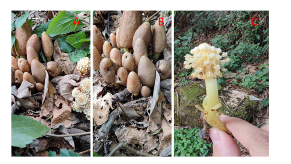 图1 红冬蛇菰:A:雄株和雌株;B:雌株;C:雄株