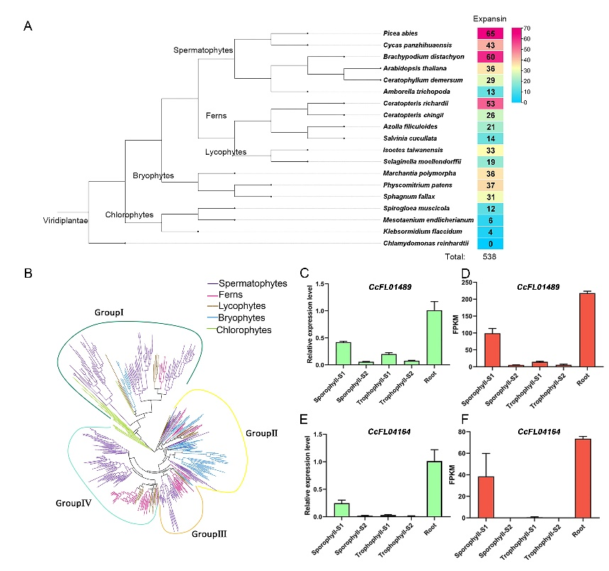 中国科学院武汉植物园陈进明研究团队联合湖北生态工程职业技术学院和比利时根特大学,以粗梗水蕨为研究对象,通过混池全长转录组测序构建高质量的粗梗水蕨基因序列,鉴定并解析了粗梗水蕨不同发育时期异形叶间差异表达基因的功能。该研究揭示了Expansin基因(EXP)家族成员的表达分化促进了粗梗水蕨异形叶的形成。为了探究Expansin基因在物种演化过程中的进化,该研究基于绿藻、苔藓、石松类、蕨类和种子植物等19个植物物种的基因组数据构建了EXP基因的系统发育树。基于系统发育树,该研究对粗梗水蕨不同EXP亚组基因构建共表达调控网络,揭示不同EXP基因差异的调控关系并进行了相应的酵母双杂交实验验证。此外,该研究对蕨类和石松类植物直系同源基因间的表达保守性进行分析,只在近缘种的两个水蕨中发现直系同源基因和EXP基因的表达较为保守,说明EXP基因表达模式的分化与物种表型差异相关。总之,粗梗水蕨基因序列的鉴定为蕨类植物的研究提供了重要的资源,该研究结果拓宽了人们对水生蕨类异形叶的分子调控机制的认识。