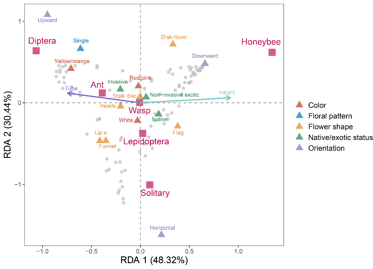 研究结果表明,传粉者对于花形状、开口方向和花朵颜色具有显著偏好。其中,鳞翅目偏好水平开口的漏斗状花朵或头状花序,双翅目偏好向上开口的黄色或橙色的头状花序,蜜蜂则偏好一二年生外来草本植物,盘状、碗状或旗形花,独居蜂偏好水平开口的唇形或旗形花,大多数传粉者类群偏好蓝紫色花。研究还提出本地木本植物(如南天竹、地椒、紫薇、柽柳等)和一些外来植物(如矢车菊、琉璃苣、大花马齿苋等)有助于提升城市传粉者多样性。由于传粉者的偏好不同,因此建议在构建传粉者友好型花园时增加开花植物的物种丰富度有利于促进传粉者的整体多样性。