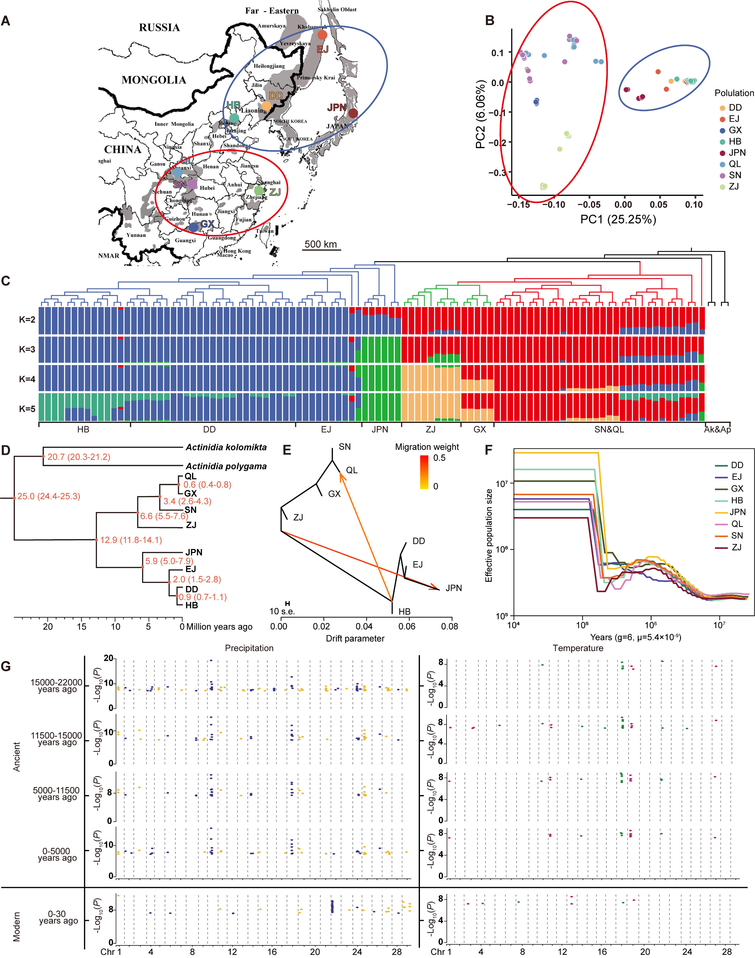 图3 软枣猕猴桃群体进化分及其与古气候关联分析