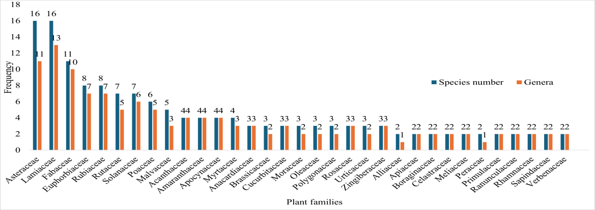 本次调查共记录当地用来治疗人类和家畜疾病的188种药用植物,隶属于163属、73科。定量数据指数显示,突发性疾病这一类别被使用传统药用植物治疗的疾病的共识度最高(ICF:0.35),其次是血液和循环相关疾病(ICF:0.33)。用于治疗皮肤疾病的植物数量最多(61种),而用于治疗泌尿生殖系统相关疾病的植物数量较少(21种)。有了这些重要的信息,再利用现代植物化学和药理学方法,从药用植物中筛选出具有生物活性的新型成分,可能为药用植物在医药领域的应用开辟新的前景。同时,现代科学方法也可以验证传统药用植物的治疗用途是否科学。