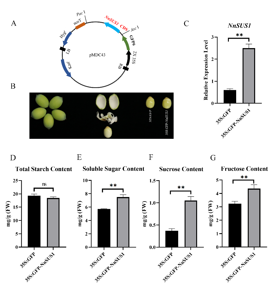A.载体构建示意图。B.莲子子叶的注射过程。C. NnSUS1基因的表达水平。 D-G.子叶中的总淀粉(D)、可溶性糖(E)、蔗糖(F)和果糖(G)含量检测。