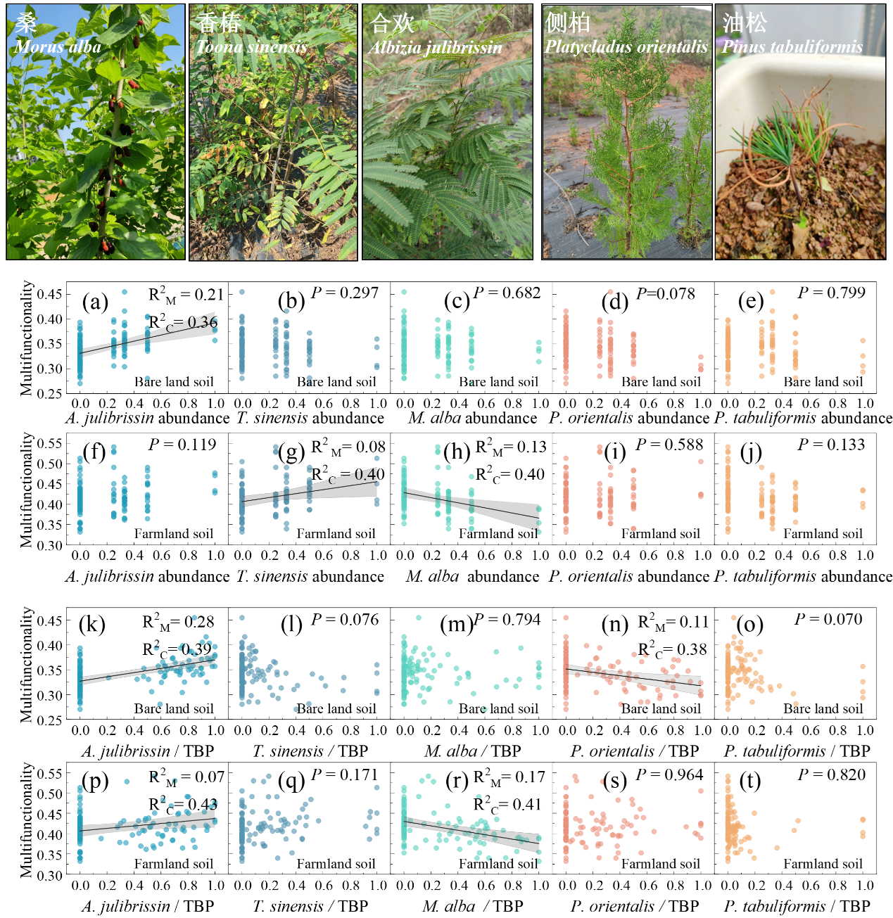 图1. 本研究中所使用的先锋树种以及植物物种相对丰度(a-j)和各物种占总生物量的比例(k-t)与生态系统多功能性的关系。