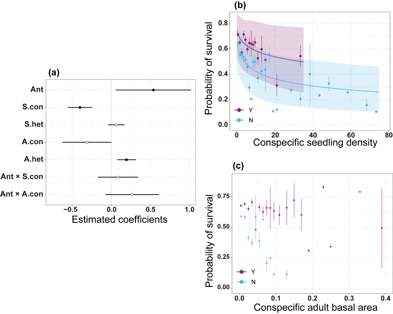 中国科学院武汉植物园植被生态学学科组以湖南八大公山亚热带山地常绿落叶阔叶混交林和西双版纳热带季节雨林动态监测样地为研究平台,分别研究了蚂蚁与植物的相互作用对密度制约的影响。在亚热带山地森林动态监测样地中,研究了蚂蚁与植物的共现关系对植物同种密度制约的影响,通过蚂蚁与植物的共现强度,将植物分为蚂蚁偏好类型的植物和蚂蚁非偏好类型的植物,结果显示蚂蚁对幼苗的存活具有显著的正效应;在热带雨林动态监测样地中,将具有花外蜜腺的植物定义为蚂蚁偏好类型的植物,没有花外蜜腺的植物定义为蚂蚁非偏好类型的植物,结果显示蚂蚁对幼苗及大树的生长均具有显著的正效应。两项研究均发现蚂蚁可以缓解植物的同种密度制约效应,拓展了自上而下的生态调控理论(植食者-植物),为研究物种共存理论提供了新的思路。