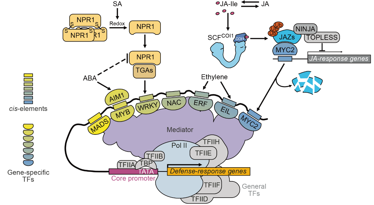 果实成熟通常伴随着果实表皮角质层和细胞壁等物理屏障减弱,酚类、含硫化合物等抑菌次级代谢物降解,抗毒素水平降低,同时糖分等营养物质积累,为病原菌生长提供了有利的环境。此外,成熟衰老还带来脂质和蛋白过氧化,会引发细胞内氧化还原状态失衡。研究表明,果实成熟调控因子在病原菌侵袭时也会参与一系列免疫调控作用。植物激素乙烯和脱落酸(ABA)不仅作用于果实成熟调控,也在果实抵御病原微生物过程中发挥重要作用,并且与免疫相关植物激素茉莉酸(JA)和水杨酸(SA)等发生交互作用。这些植物激素信号下游涉及一系列转录调控级联事件,涉及RNA聚合酶、基础转录因子和特异性转录因子如MADS、NAC、WRKY、MYB、EIL和ERF等形成的调控网络,主要通过Mediator复合体形成了果实中特异性的免疫调控作用模式(图1),这为阐明果实响应病原微生物免疫机制,促进食品安全具有重要的理论和应用价值。