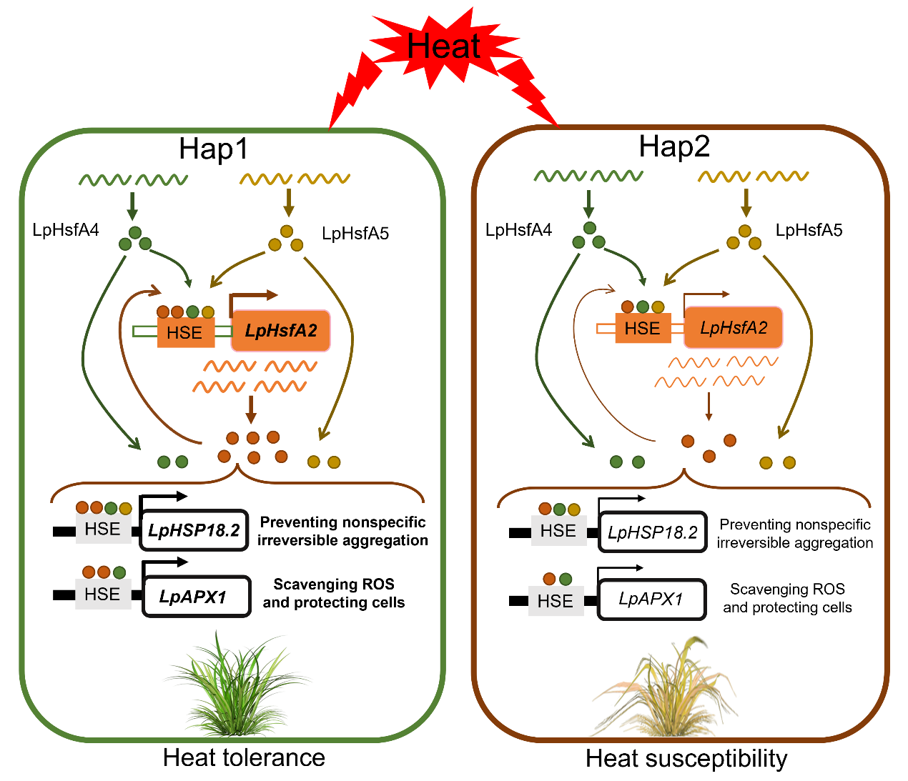 综上所述,该研究提出了LpHsfA2调控多年生黑麦草抵御高温胁迫的分子机制模型(图1),并鉴定出LpHsfA2的耐高温优异等位变异,研究结果为培育耐高温黑麦草新品种提供了分子元件。