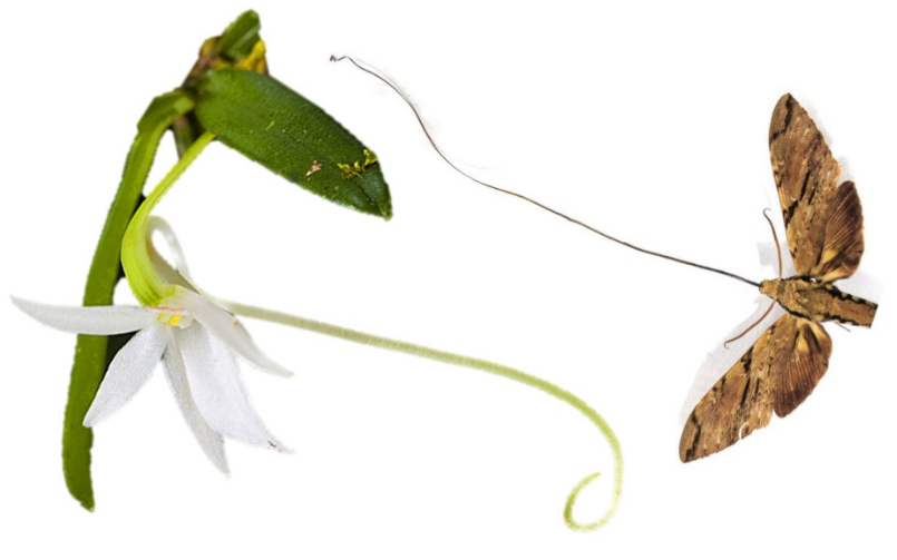 1862年,达尔文收到了来自马达加斯加的长距彗星兰标本,便预言有一种长喙的天蛾可以吸食其花蜜并传播花粉。1903年,这种天蛾被发现,即预言长喙天蛾,而长距彗星兰也从此有了达尔文兰的别名(图1)。达尔文兰与预言长喙天蛾的故事,生动地反映出生物互作中性状匹配的现象。