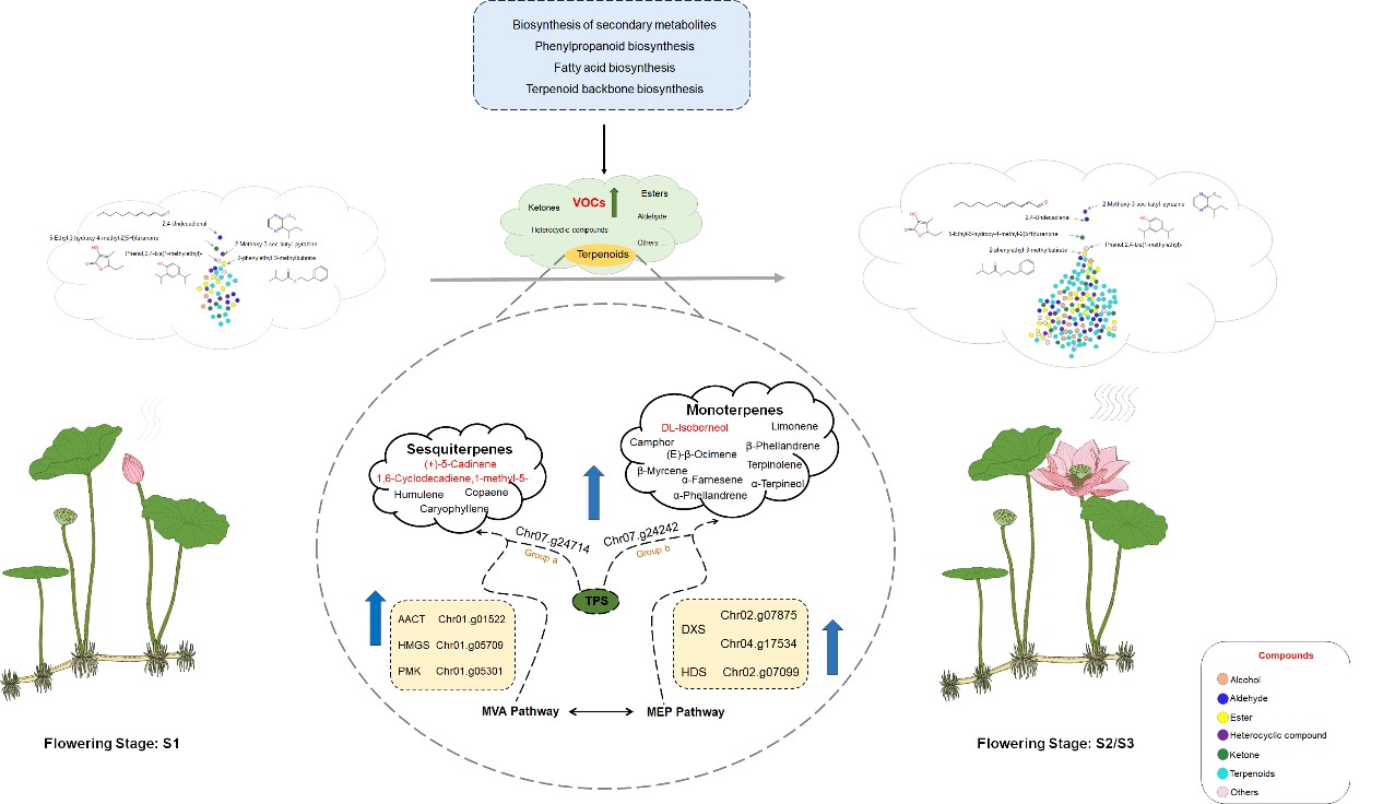 对荷花开花过程中(S1-S4时期)雄蕊进行转录组分析,鉴定到13,034个基因表达显著变化,显著富集于单萜类生物合成、萜类骨架生物合成和苯丙烷生物合成途径等,其中与萜类合成相关的甲羟戊酸(MVA)和甲基赤藓糖醇磷酸(MEP)代谢通路基因尤为显著,表明MEP和MVA途径在荷花挥发性萜类香气物质形成中的重要作用。萜烯合酶(TPS)在萜类物质的合成中发挥着重要作用,研究者在莲中鉴定出17 TPS基因,其中5个基因在开花时期中高量表达,且Chr07.g24242 和 Chr07.g24714在花器官雄蕊和花瓣中显著特异性表达,被认为是参与荷花萜类香气物质形成的重要候选基因。