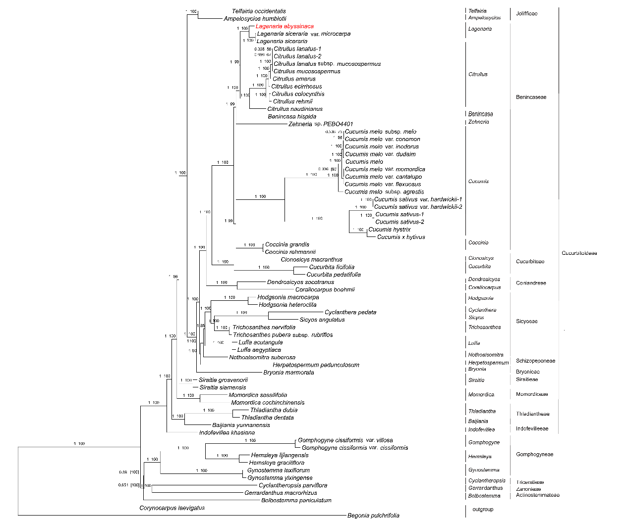 图1 东非葫芦与其他葫芦科物种系统发育关系