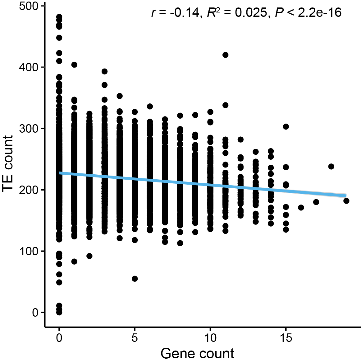 选择性清除和GEA分析显示,虽然仅有少量转座子变异位点(0.033%–0.40%)呈现正选择信号,但有更高比例(0.081%–0.76%)的位点与气候因子显著相关(图4,图5)。这些受选择或与气候相关的转座子位点主要与植物器官发育、胁迫响应及防御相关基因存在密切关联。加权基因共表达网络分析揭示了TEs相关环境适应基因比SNPs相关基因具有显著更多的连接边,表明其具可能有更强的调控效应。基因组分布特征分析发现,基因稀疏区域的转座子丰度显著高于基因密集区(图6),且这些区域内转座子变异位点的XtX和BF值均显著升高。这些发现不仅深化了人们对植物适应性进化基因组机制的认识,也为三叶青的引种驯化、分子育种和遗传资源保护提供了重要理论依据。