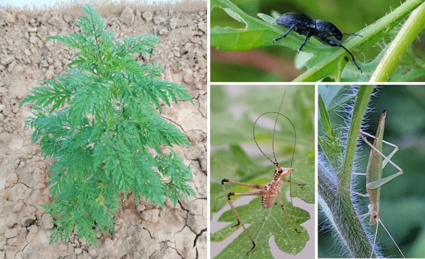 图1: 豚草及取食它的代表性昆虫 (万金龙拍摄)。