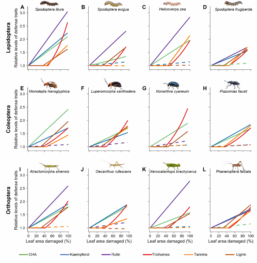 研究团队以在中国广泛分布的一年生草本植物——豚草 (Ambrosia artemisiifolia) 为研究对象,结合来自鳞翅目、鞘翅目、直翅目的12种植食性昆虫 (图1),针对豚草的多种机械和化学防御性状开展了系统实验。