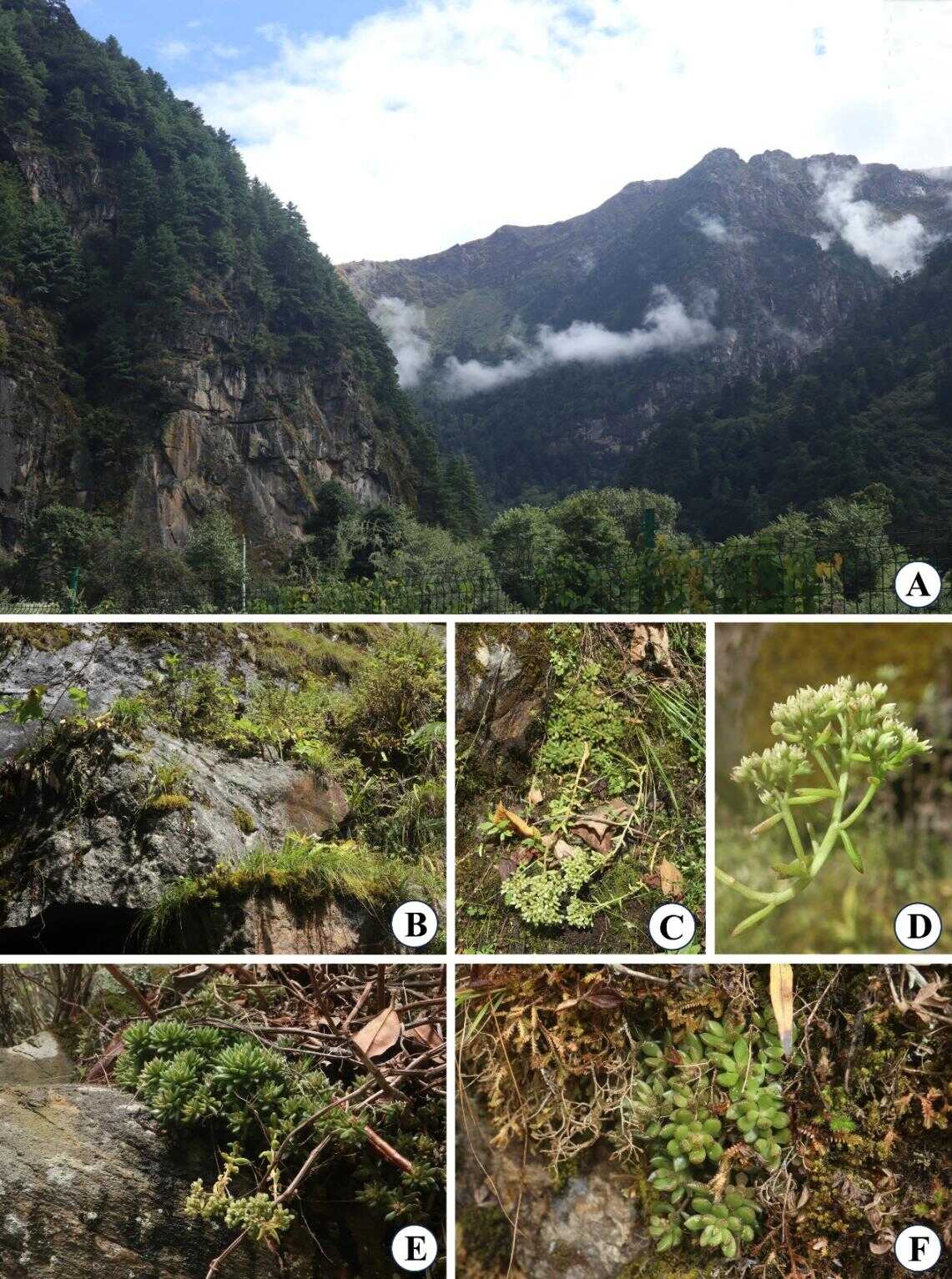 2023年8月,中国科学院武汉植物园青藏高原二次科考队员在西藏错那科考时,在勒布沟地区山谷石壁上意外发现一种奇特的多肉物种。经野外初步观察,该物种具肥厚的基生叶,花序较大且直立,雄蕊1轮,符合石莲属特征(图1)。2024年团队成员再次前往错那市勒布沟对该物种进行补充采样,此次采集进一步补充了形态解剖学资料,包括凭证标本、DNA材料和活体材料等。