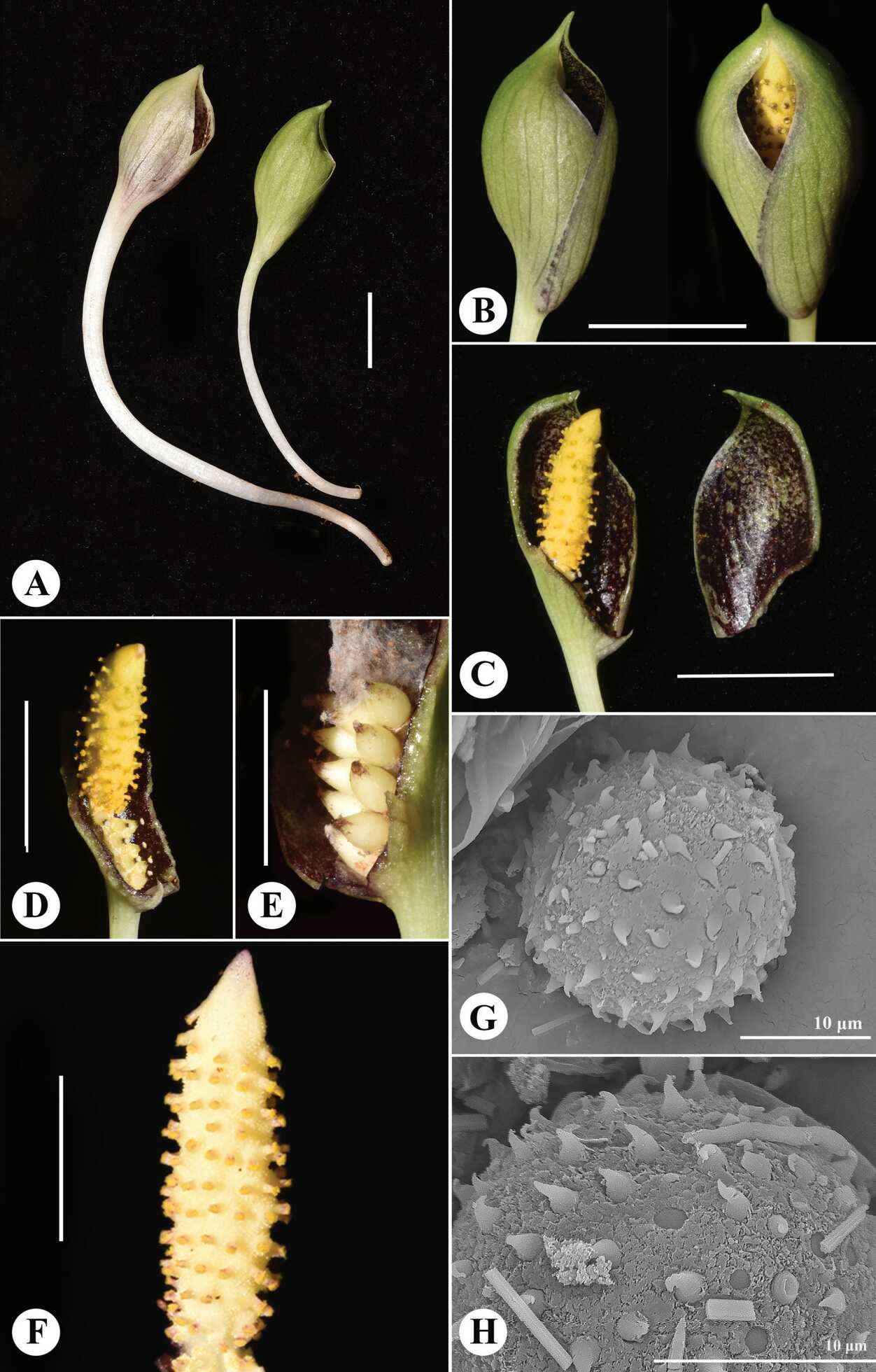 在王青锋研究员的指导下,魏能博士、王生位博士等人围绕该灰岩芋属植物开展了系统的分类学研究。在充分的文献查阅和标本比对基础上,结合详细的形态解剖和扫描电镜观察,最终确认其为灰岩芋属新物种。形态上,该新种具有单雄蕊的雄花,雄蕊单枚且排列疏松,这与属内所有其他物种具合生雄蕊的特征形成鲜明对比。此外,其内部紫色的佛焰苞、黄色肉穗花序以及短而呈深紫色的花柱,使其易于同近缘种C. darainense区分开(图2)。研究人员还对该属所有物种进行了系统梳理,修订了该属的分类检索表。该新种在审稿过程中,被国际天南星科分类学家Simon Mayo博士评论为“undoubtedly distinct”。新种的产地达莱纳地区,位于马达加斯加北部的洛基马纳巴托保护区(Loky Manambato Protected Area)内,该区域以极高的生物特有性和脆弱的生态系统著称。此次新种的发现进一步凸显了其保护价值。