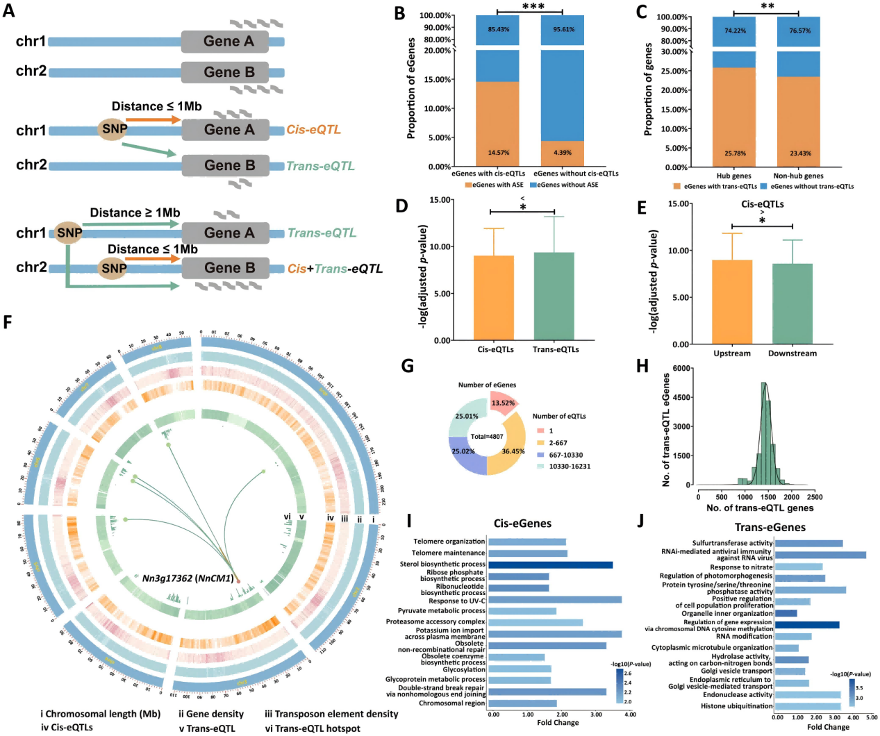 图1. 莲属植物杂交群体中顺式和反式表达数量性状位点(eQTL)的鉴定。