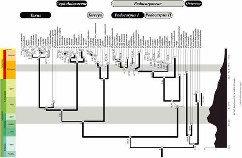 基于rbcL序列利用“宽松分子钟”模型重建的裸子植物系统发育关系图