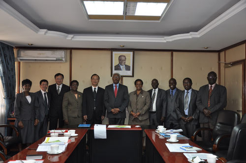 肯尼亚高等教育与科技部常任秘书长Prof. Crispus Kiamba(右六)接见到访的武汉植物园党委书记、副主任罗志强(左五)一行