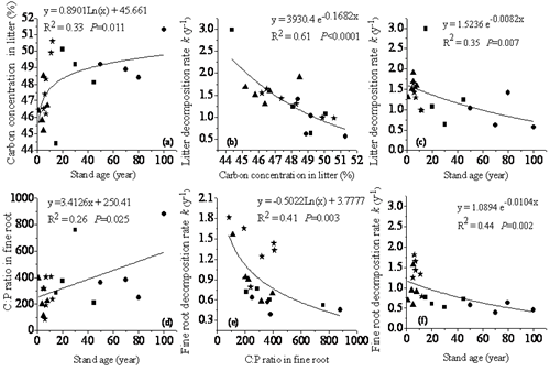 凋落物与细根的质量参数与样地年限、分解速率的关系图