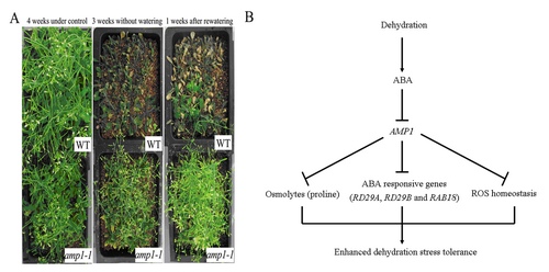 AMP1缺失突变体的抗旱性分析(A)及AMP1参与植物抗旱性的分子机理(B)。