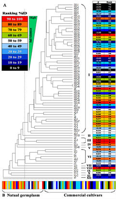 在武汉植物园草坪种质资源学学科组傅金民研究员的指导下,胡涛博士以来源于21个国家的75份多年生黑麦草为材料,采用NaCl进行水培筛选,建立了耐盐性状数据库;通过因子分析(FA)和主成份分析(PCA)构建了回归数学模型F=0.49×F1+0.303×F2+0.0.207×F3,并鉴定出耐盐多年生黑麦草种质8份。本研究对7个功能性状的多态性进行分析,发现来源欧洲地区及野生型的多年生黑麦草功能性状平均标准偏差和变异系数都最大,多态性最丰富,而在亚洲地区,多年生黑麦草功能性状的平均标准偏差和变异系数都最小,多态性较低。通过判别分析方法用功能性状指标对75个多年生黑麦草进行聚类分析,得到了与分子标记聚类相似的结果:来源相同地区的多年生黑麦草多聚类在同一组或亚组内。本研究还对多年生黑麦草遗传关系和其耐盐性进行相关分析,发现耐盐能力接近的材料其遗传关系也较近,野生多年生黑麦草耐盐能力高于栽培品种。