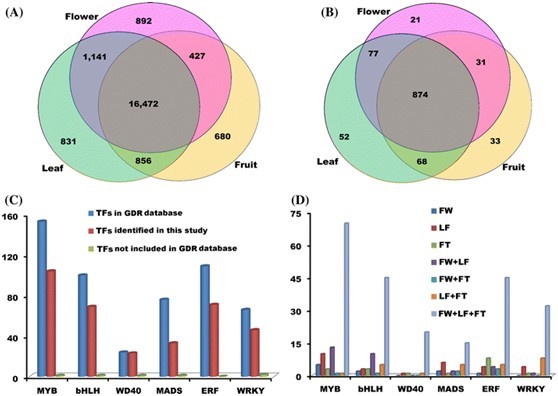 图1 桃转录组基因和转录因子的分类及其组织表达特性