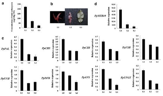 同时,该学科组通过对红叶桃、普通桃相关基因序列、表达情况的比较分析,发现光呼吸相关的信号通路部分基因(GDCH 和GOX)在遮光、热胁迫处理以后表达量上升,而花青素相关的结构与调节基因则呈下降趋势。在拟南芥的花青素合成结构基因chi的突变体中发现,虽然该突变体不能积累花青素,但在相关条件下,GDCH 和GOX基因同样出现表达上调。这些结果表明光呼吸信号途径中的部分基因可能是花青素合成和积累途径的拮抗调节因子。该结果以“Coordinated regulation of anthocyanin biosynthesis through photorespiration and temperature in peach (Prunus persica f. atropurpurea)”为题,在林业科学重要SCI期刊Tree Genetics & Genomes(JCR专业领域排名top10%)上发表。